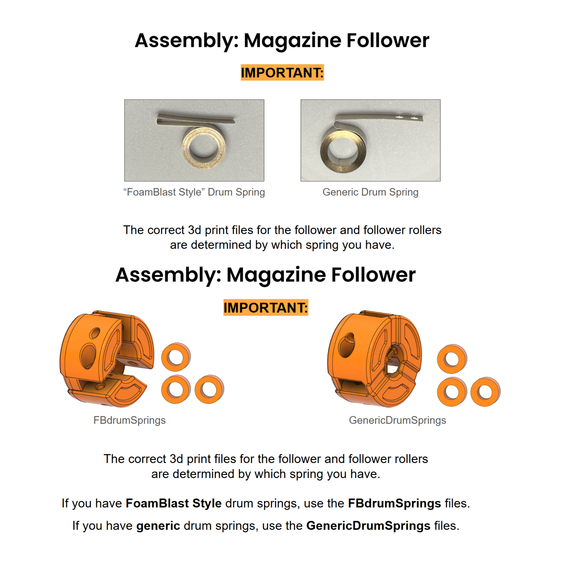 - We’ve chosen to use Foamblast drum springs, as they consistently deliver better performance compared to generic alternatives during the Beta. (Please make sure you print the correct parts for these springs)
