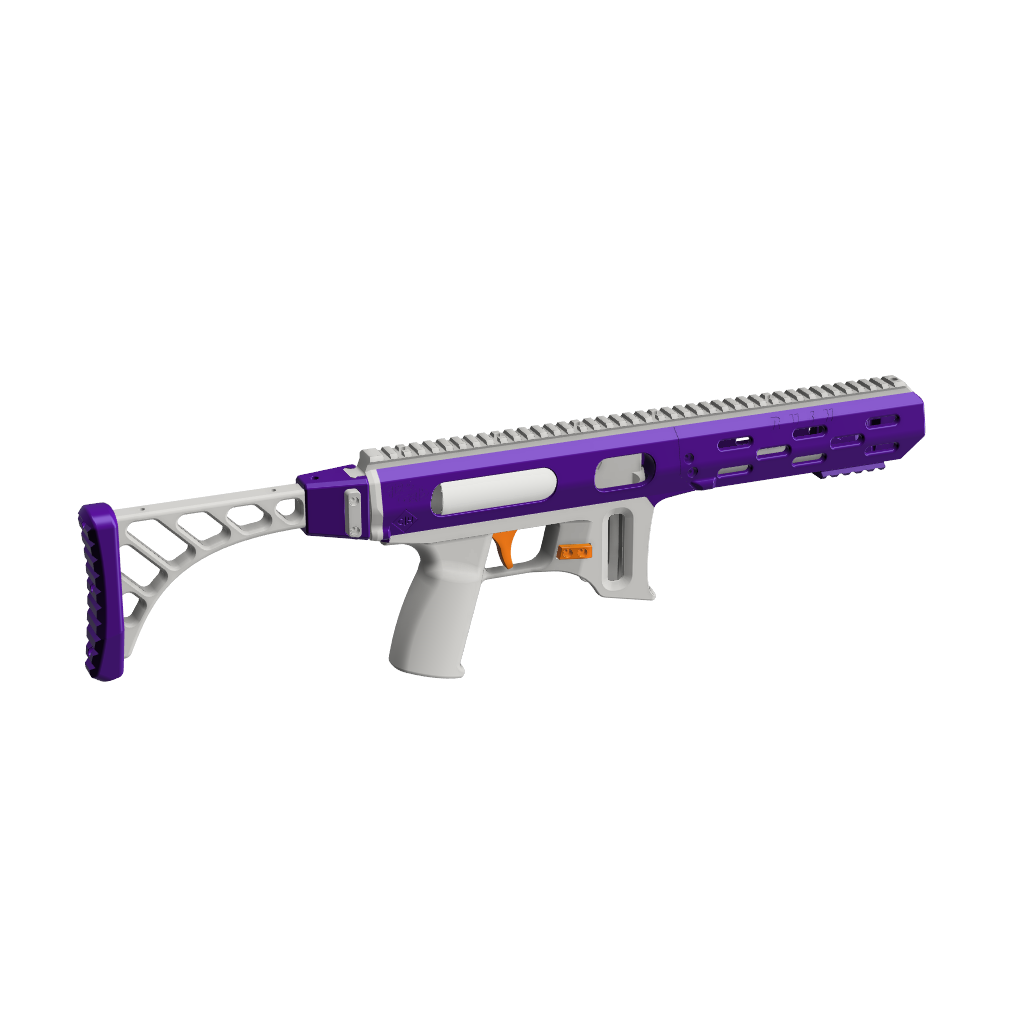 Introducing the Crush, born from the Rush with a new twist! With heat inserts, a linear rail, and quick-release stock, this blaster will give you a premium experience. Other standout features include straight talon mags, a smaller grip, and a more compact size.